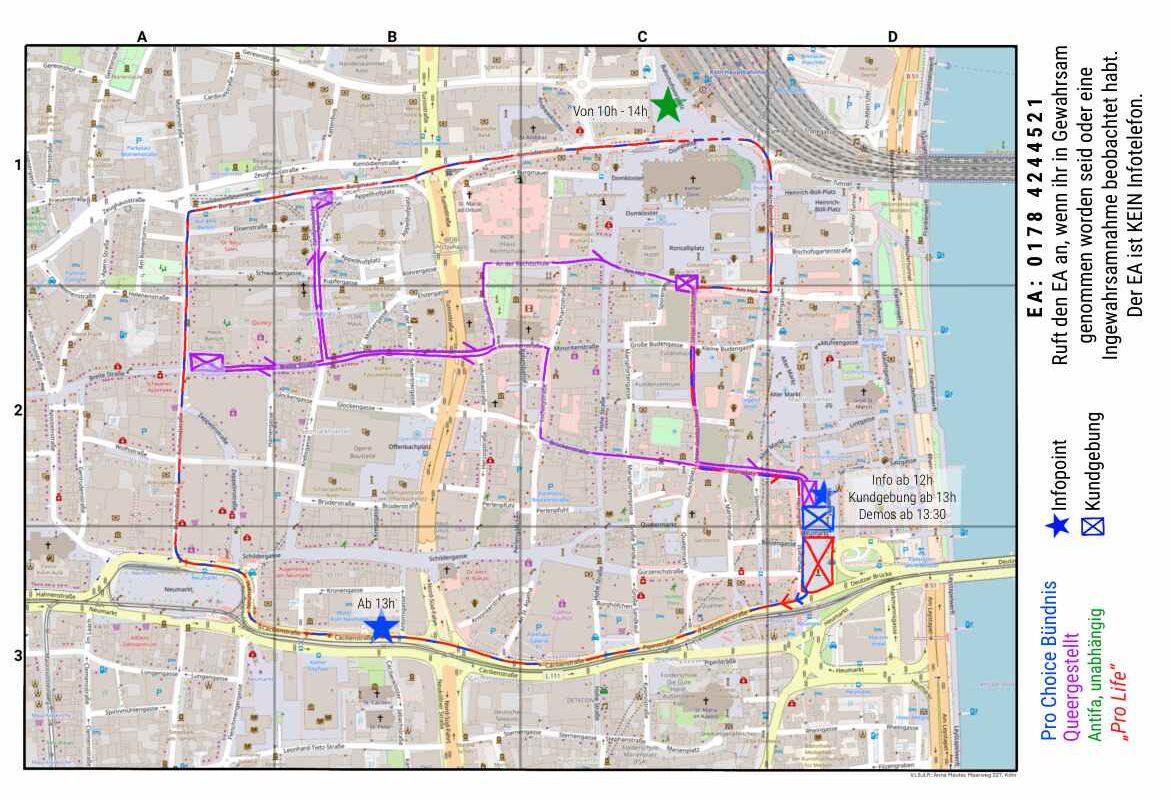 An dem Tag wird es viele weitere Aktionen im Innenstadtbereich geben. So wird bereits ab 10 Uhr ein Infopoint am Bahnhofsvorplatz bestehen. Dort wird der Islamfeind und verurteilte Rechtsextremist Michael Stürzenberger im Windschatten des „Marsches für das Leben“ seine regelmäßig stattfindende Anti-Islam Kundgebung abhalten. Falls ihr früh genug anreist, unterstützt gerne die antifaschistische Gegenkundgebung und holt euch dort die Aktionskarte mit allen Infos ab. Download als pdf hier.