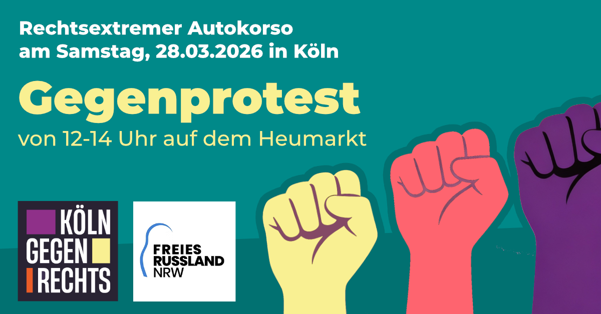 Die Initiative „Freies Russland NRW“ ruft zum Gegenprotest von 12 bis 14 Uhr auf dem Heumarkt gegen die rechtsextreme Putinproaganda auf.